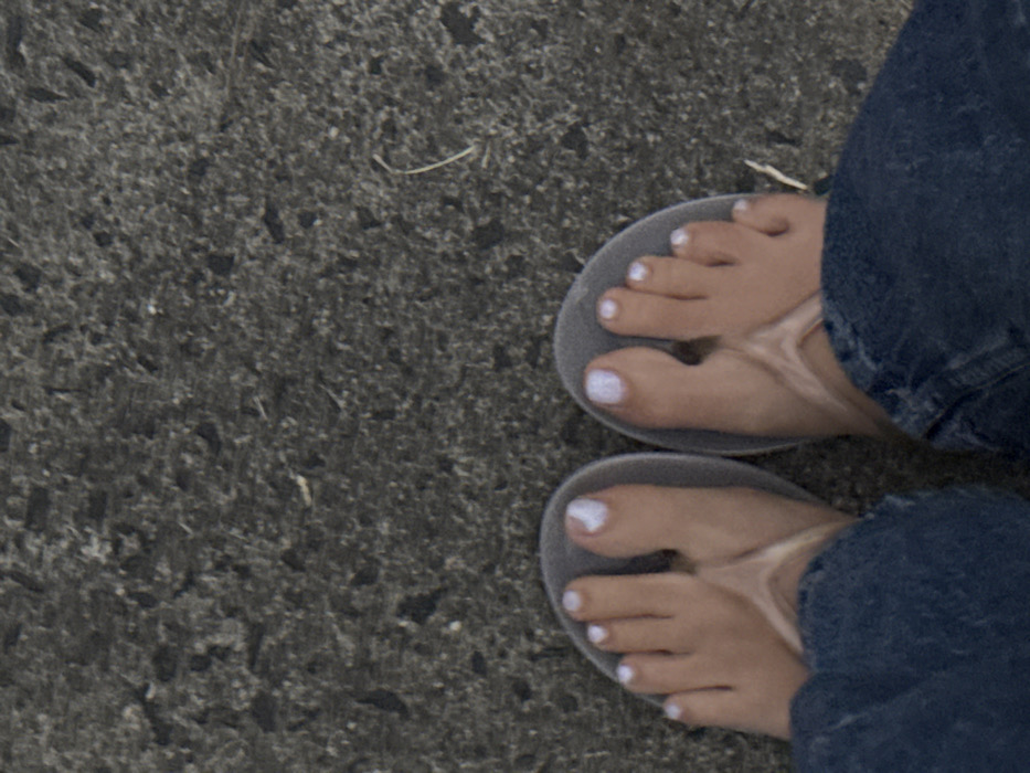 A downward-facing photograph captures the lower legs and feet of an individual on a textured dark grey ground surface, consistent with asphalt or coarse concrete, located in Culburra Beach, Australia. The subject is wearing light grey thong-style flip-flops. Both feet are bare within the flip-flops, and all visible toenails are painted with white polish. The lower portions of dark blue denim jeans are visible immediately above the flip-flops, partially obscuring the ankles. The ground exhibits minor surface debris, including a few small, light-colored fibrous strands.
