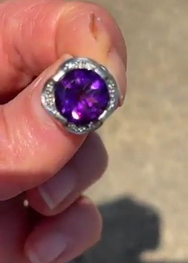 A hand holds a ring in focus against a blurred background. The ring has a large, oval-cut, deep purple stone, surrounded by smaller clear stones set in a silver-colored metal. The hand appears to be fair-skinned with short fingernails. There is a small mark on the side of the index finger. The background is out of focus, suggesting a paved surface, with shadows also visible. The video seems to have been shot in daylight.