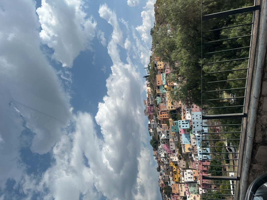 A wide shot depicts a densely populated hillside in Guanajuato City, Mexico, under a partly cloudy blue sky. The hillside is covered with numerous multi-story buildings painted in a vibrant array of colors, including pink, yellow, orange, light blue, teal, and white. These structures are tightly packed, ascending the steep terrain, with several slender trees visible amongst them, particularly near the crest. In the immediate foreground, a black metal railing runs horizontally, surmounting a light grey stone wall. Partially visible behind the railing are green deciduous trees. In the lower midground, a road or path is discernible, with a white vehicle and a red-striped vehicle. The bottom-left corner of the image shows a portion of a dark vehicle's side-view mirror. The sky occupies the upper half of the frame, featuring bright blue patches interspersed with large, white, and grey cumulus clouds. A faint reflection or glare is present in the upper-left sky section. No individuals are visible.