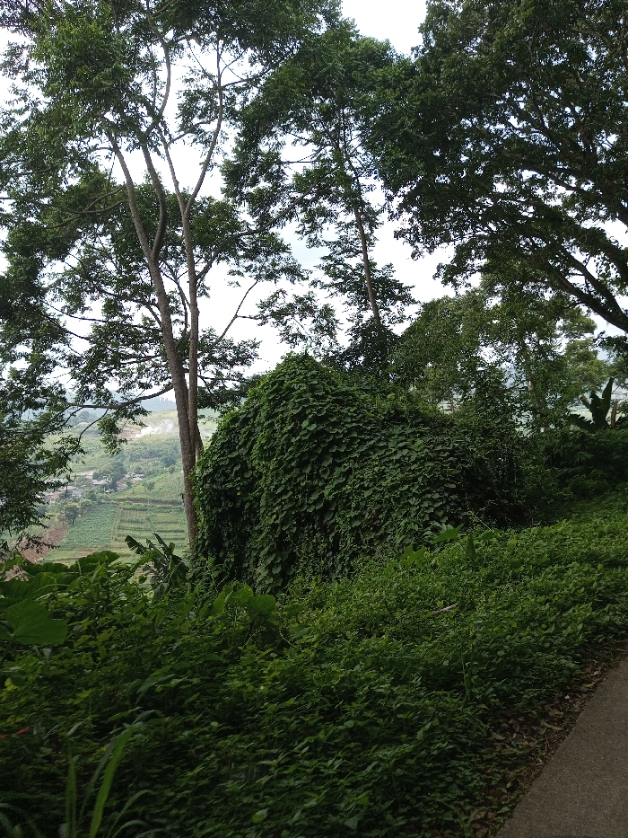 The image displays a verdant, hilly landscape in Matale, Sri Lanka, observed from an elevated perspective under an overcast sky. The foreground features a dense accumulation of low-lying green vegetation and groundcover, with a narrow concrete or paved path visible along the bottom right edge, receding into the scene. A prominent, large, irregularly shaped mound or natural formation in the midground is entirely covered by a thick layer of dark green vines with numerous, distinctly visible heart-shaped leaves. Several tall, slender trees with visible trunks and sparse to moderately dense green foliage occupy the midground and upper portions of the frame. Beyond the immediate foliage, a valley unfolds, presenting multiple tiers of terraced agricultural fields in shades of light green and yellowish-green. Scattered clusters of small buildings or houses are discernible within the valley. A localized plume of light-colored smoke or mist rises from a section of the valley in the upper-left background. Distant hills or mountains, appearing hazy, form the horizon. The sky is a uniform light grey, indicating overcast conditions. There are no individuals, animals, or vehicles present. The scene is static.