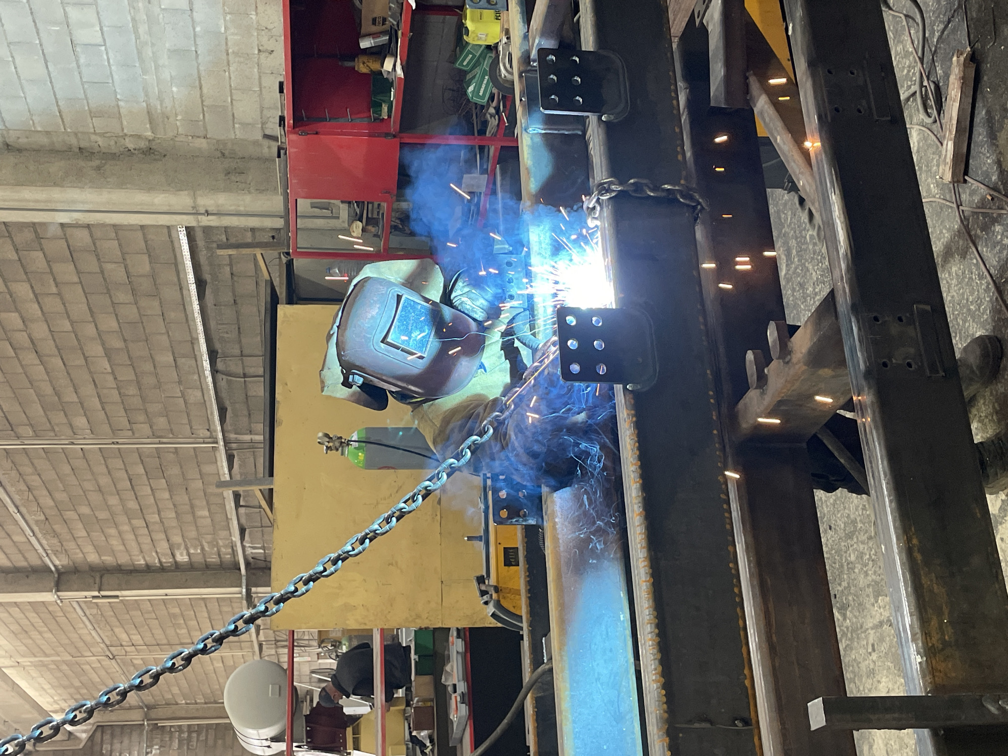 A person is welding a metal structure in what appears to be an industrial setting