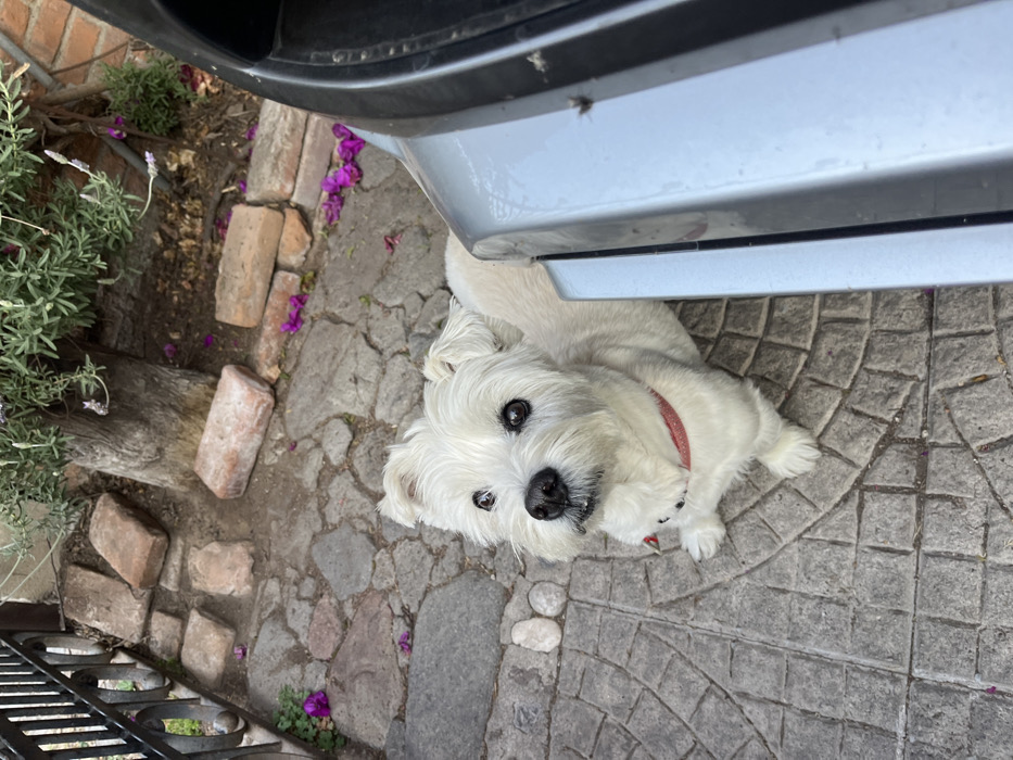- "A small white dog lies on a gray stone patio beneath the bumper of a silver car" by FM-c5Nd33, licensed under CC BY 4.0