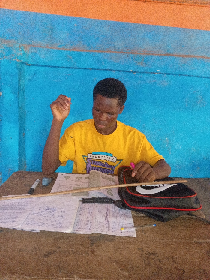 The image displays a young male individual seated at a wooden desk in Onitsha, Nigeria