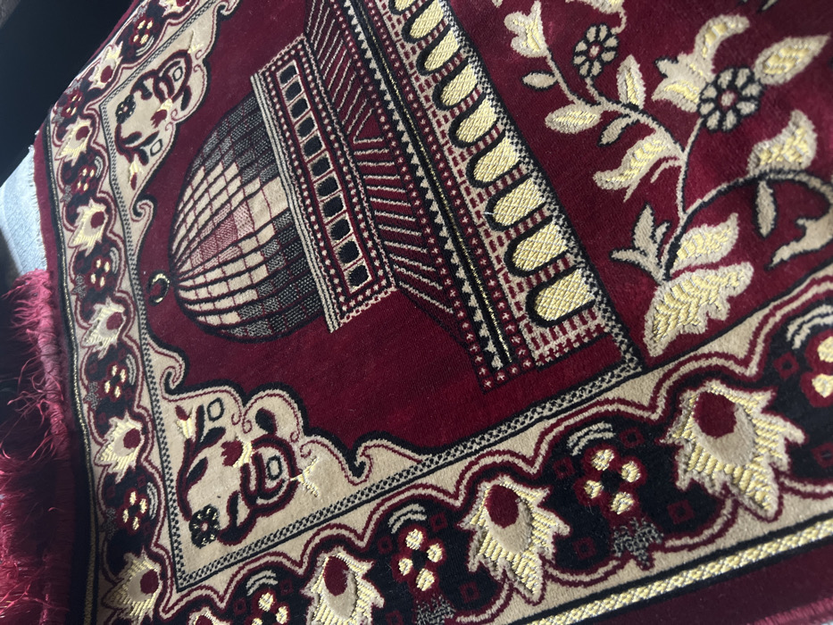 - "A deep maroon prayer rug, oriented with its fringe at the top, is depicted from an oblique, downward-looking angle" by FM-3tNQq2, licensed under CC BY 4.0