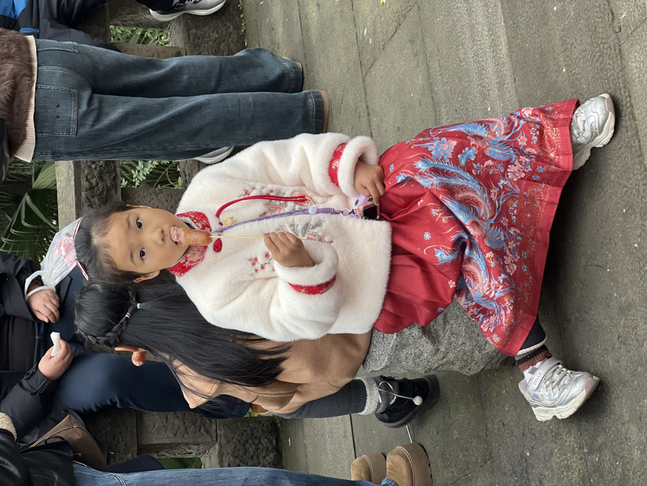 A young girl wearing a white, red-trimmed jacket and a red dress with a floral and bird pattern sits on a stone surface. She holds a sausage on a stick in her hand, partially in her mouth. She wears grey sneakers. Other people are visible, including a person with long black hair and black shoes. The background consists of concrete and vegetation, creating a casual outdoor setting.