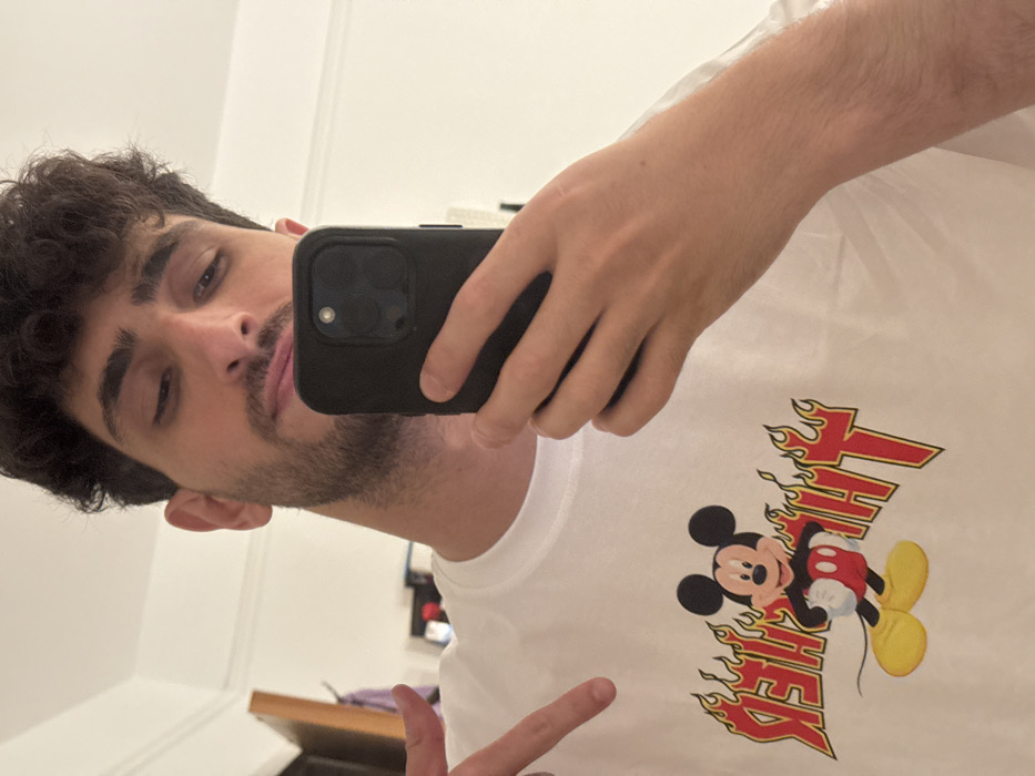 An adult male is depicted in a mirror selfie, captured from the chest up in an indoor environment. He has dark, curly hair and stubble. He wears a white crew-neck t-shirt featuring a graphic of Mickey Mouse flanked by red flames containing the reversed word 'THRASHER'. His right hand holds a black smartphone, partially obscuring his face, while his left index finger points towards the t-shirt graphic. The background shows a plain, light-colored wall and a blurry reflection of a dark furnishing and hanging garments on the left. The specific location within the city of New York, United States, cannot be determined from the visual evidence.