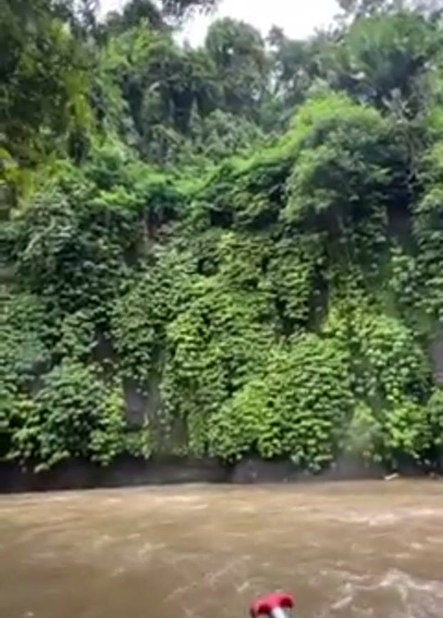 river rafting trip through a densely vegetated, tropical area. The water is brown and appears swift-moving. The river banks are covered with lush green vegetation, clinging to what seems to be a wall or cliff. A red and yellow paddle is visible in the foreground, indicating that the video is taken from the perspective of someone in the raft. The sky is overcast, suggesting it may be raining.