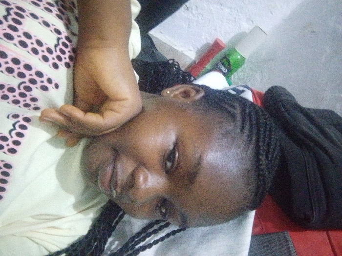 An individual, identified as female, is depicted lying on her left side, oriented diagonally within the frame. She possesses dark skin, her hair styled in cornrows or braids, and a small gold-colored earring in her visible ear. Her gaze is directed towards the camera. Visible moisture is present on her lower lip and chin. She is partially clad in a light-colored garment patterned with repeating rows of dark circular or oval shapes. A dark garment or blanket covers her upper body, with a red garment visible beneath. Her right arm is bent, and her hand is positioned near her head. The immediate background consists of a light-gray, textured surface, likely an indoor floor or wall, upon which a green bottle with 'TESO' partially visible and a red cylindrical object are resting. This scene is situated in Keffi, Nigeria.