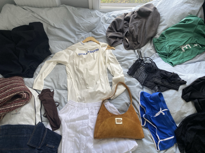 The scene, located in Champs-sur-Marne, France, depicts various clothing items and accessories spread across a bed within an interior room. The bed is covered with light blue and white striped bedding. A window is partially visible in the upper background, revealing green outdoor foliage. On the top-left, a pair of black relaxed-fit pants or joggers is present. Below these, a folded, thick textile item with maroon and cream horizontal stripes, resembling a blanket or throw, is visible. Adjacent and partially underneath, a white garment, likely a jacket or vest, displays "MONCLER" in black text. To the far left, a section of dark blue denim jeans is seen. Centered on the bed is an off-white, long-sleeved top with "COURREGES" written in blue capital letters across the chest, laid flat, appearing to be on a wooden hanger. Beneath this top, a white pleated skirt or shorts is spread out. A thin, dark brown garment, possibly a camisole, is partially obscured beneath the white pleated item. On the upper-right, a pair of dark gray or brown sweatpants is loosely placed. Adjacent to them, a crumpled green long-sleeved shirt with faint white lettering on its front is visible. Below the sweatpants, a black lace bodysuit or bustier with thin straps and a visible hook-and-eye closure is laid out. Further down, a pair of bright royal blue athletic shorts with white trim and white drawstrings is present. A crumpled black garment, possibly a top or dress, is situated in the bottom-right corner. Towards the bottom-center, a tan or camel-colored suede hobo-style handbag featuring a prominent silver "C" shaped metal clasp on its front flap is positioned. No individuals are present in the scene.