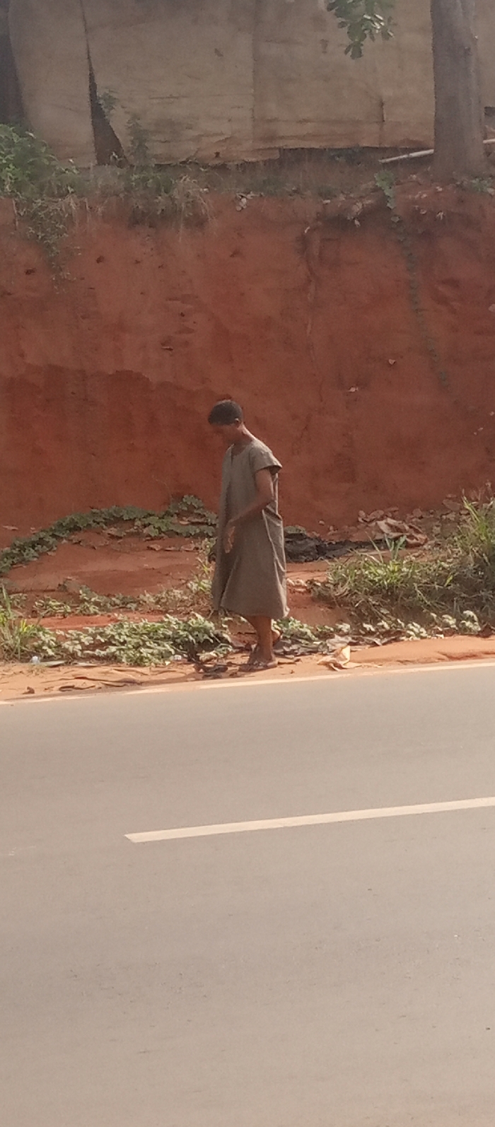 The image depicts an outdoor scene in Nkpor, Nigeria. A single adult individual, of lean build, walks from right to left on a reddish-brown dirt shoulder. This person is dressed in a light grey, short-sleeved, knee-length tunic and flip-flops, with their head angled downwards. The dirt shoulder borders a grey asphalt road, visible in the foreground, which features a single white lane marking. Behind the individual and the shoulder, a steep, reddish-brown earthen bank rises. The bank exhibits erosion patterns and sparse green vegetation, including groundcover and sections of tree trunks and foliage along its upper edge. Scattered debris, including light-colored refuse resembling paper and darker amorphous materials, is present on the dirt shoulder near the bank's base. No other individuals or interactions are visible.