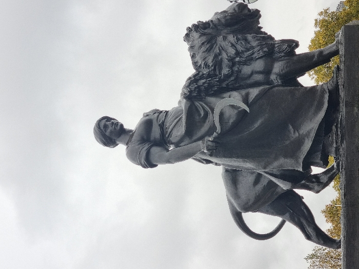 The image displays a large, dark bronze sculptural group from the Victoria Memorial, situated in front of Buckingham Palace in London, United Kingdom. The central subject is a female figure, muscular in build, clad in a draped garment with rolled sleeves, holding a crescent-shaped sickle in her right hand. Her head is turned to the viewer's left, displaying a resolute expression. Adjacent to her right, a male lion with a full mane stands, its head also oriented left, paralleling the female's gaze. The figures rest on a dark, unadorned plinth. The background consists predominantly of an overcast, light grey sky. In the lower portion of the background, visible behind the statues, are sections of green and autumnal foliage from trees. A metallic vertical element, possibly part of a light fixture, is partially visible on the far right edge of the frame.