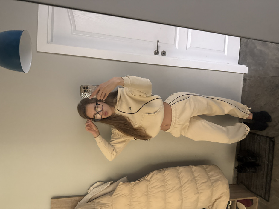 A young female is depicted taking a mirror selfie indoors. The location is an interior room within an unknown city and country. The subject, a female with long brown hair, is positioned centrally, facing a full-length mirror. She wears black-framed glasses and has her lips pursed in a "duck face" expression. Her right hand holds a smartphone, equipped with a heavily textured or rhinestoned case, pointed towards the mirror to capture the reflection. Her left hand is raised, with fingers touching her hair near her left temple. She is dressed in a two-piece cream-colored tracksuit. The top is a cropped hoodie featuring a black stripe accent, a small dark logo (resembling a crocodile) on the left chest, and a kangaroo pocket. Her midriff is exposed, revealing a belly button piercing. The bottom consists of matching sweatpants with black stripe details along the outer seams. She wears dark, possibly black, ankle socks or low-cut boots. The surrounding environment features plain light grey walls. To the left of the subject, a wooden vertical board or coat rack is visible, from which a beige puffer vest and a cream-colored fluffy coat are hanging. Below these items, on a dark grey floor mat, two pairs of dark shoes are present. To the right of the subject, a white door with a silver handle and a keyhole is reflected in the mirror. A light blue overhead light fixture is partially visible in the upper right quadrant of the image. The floor appears to be a light-colored tile or linoleum.
