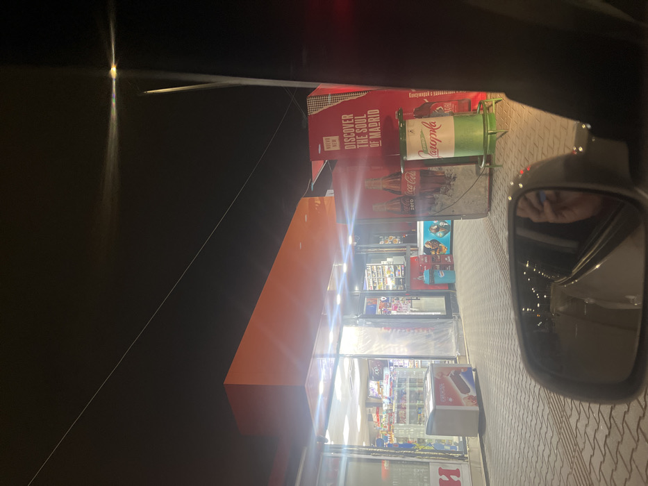 The image depicts a nighttime scene from the interior of a vehicle, looking towards a commercial establishment in Sofia, Bulgaria. The primary subject is a brightly lit minimarket or convenience store, identifiable by its large glass storefront and an extended orange-colored facade or canopy above. Inside, shelves stocked with various products are visible under fluorescent lighting. Exterior to the store, two stand-alone refrigeration units are present: one white unit with a dark ice cream advertisement on its front is positioned to the left of the main entrance, and another blue and white unit displaying frozen goods is to the right. A prominent red display featuring two large Coca-Cola Zero bottles stands next to the second refrigeration unit. Adjacent to these displays is a green and white cylindrical object, possibly a branded cooler or refuse bin, marked with "Каропла" (Karopla) in Cyrillic script. Behind these objects, a large red advertising banner is partially visible, showing Cyrillic text "КЪДЕ НОВ" and the English phrase "DISCOVER THE SOUL OF MADRID." The ground directly in front of the store is paved with grey interlocking bricks. Overhead, a thin wire crosses the dark night sky. To the far right, a street light is visible, emitting a strong lens flare. The bottom left of the image is dominated by the vehicle's left side-view mirror, reflecting a distant street with lights and partially showing a human hand with blue-painted fingernails. No individuals are explicitly present outside the store. The scene suggests a transient stop by the vehicle at a commercial point of interest.