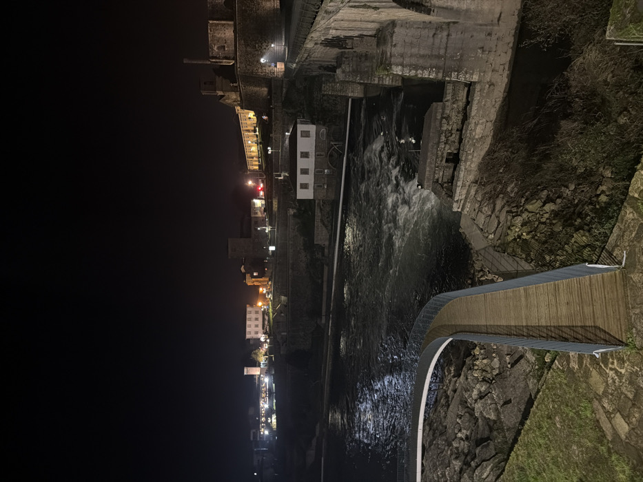 A night view reveals a river, partly illuminated, rushing between stone structures. A curved, wooden footbridge spans the water, flanked by rocky terrain and vegetation. Buildings are illuminated in the distance. A white building with visible windows stands near the river. The top of the image shows illuminated structures, including a stone castle, and the night sky is predominantly dark.