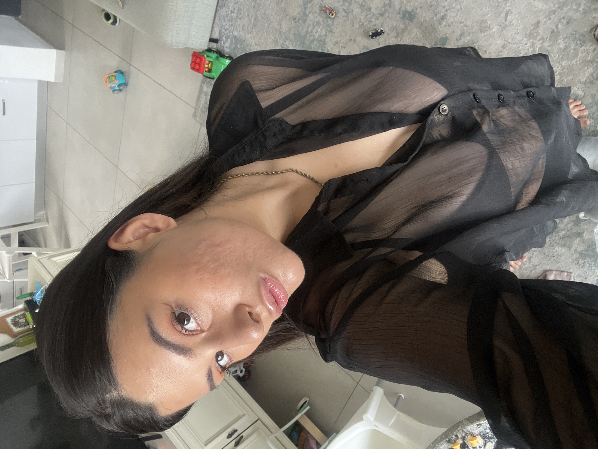 A woman is pictured in a photograph indoors in what appears to be a domestic environment. The woman has dark hair and is wearing a sheer black top with visible buttons. A gold chain necklace is visible around her neck. The background includes tile flooring, kitchen cabinetry, and toys scattered around. The location in Kiryat Bialik, Israel is indeterminate.