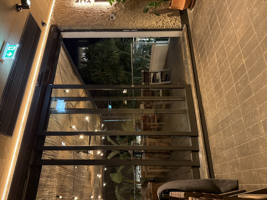 The image presents a nighttime view of the partially open entrance to an outdoor patio area of a commercial establishment, likely a restaurant or bar, located in Cascais, Portugal