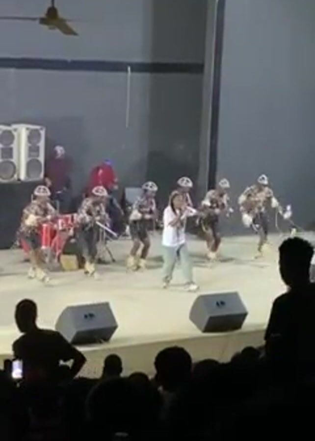 A man in a white shirt and green pants is singing into a microphone on a stage. He is surrounded by seven dancers in identical costumes who are simultaneously playing drums and dancing. The dancers are wearing dark outfits with intricate designs and white hats. Behind them is a drummer and some equipment. There is a large speaker on the left side of the stage. The stage is brightly lit. In front of the stage is a crowd of people who are watching and recording the performance. The setting appears to be an indoor auditorium or theater.