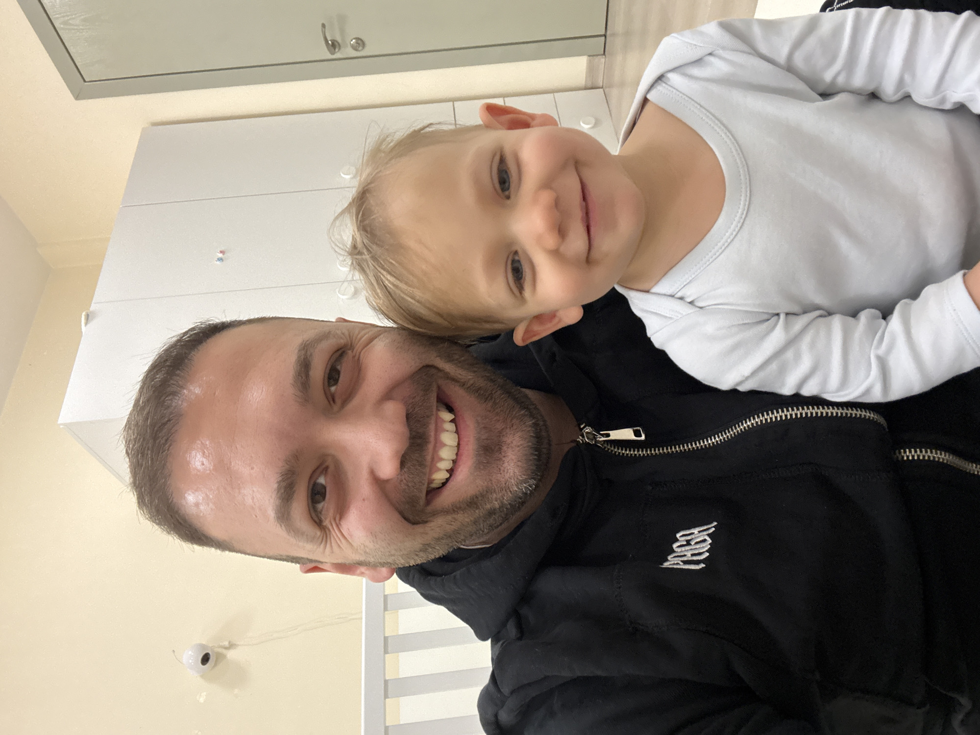 A selfie shows a man and a young child. The man, in the foreground, is smiling broadly at the camera. He has short brown hair, a beard, and is wearing a black zip-up hoodie with white embroidered lettering on the left side. The child, in the background, is smiling with the side of their face resting on the man's shoulder. They have blonde hair and are wearing a white long-sleeved onesie. The background consists of white cabinets and a cream-colored wall with a white baby crib partially visible. The image appears to be taken indoors, possibly in a residential setting in Ruse, Bulgaria.