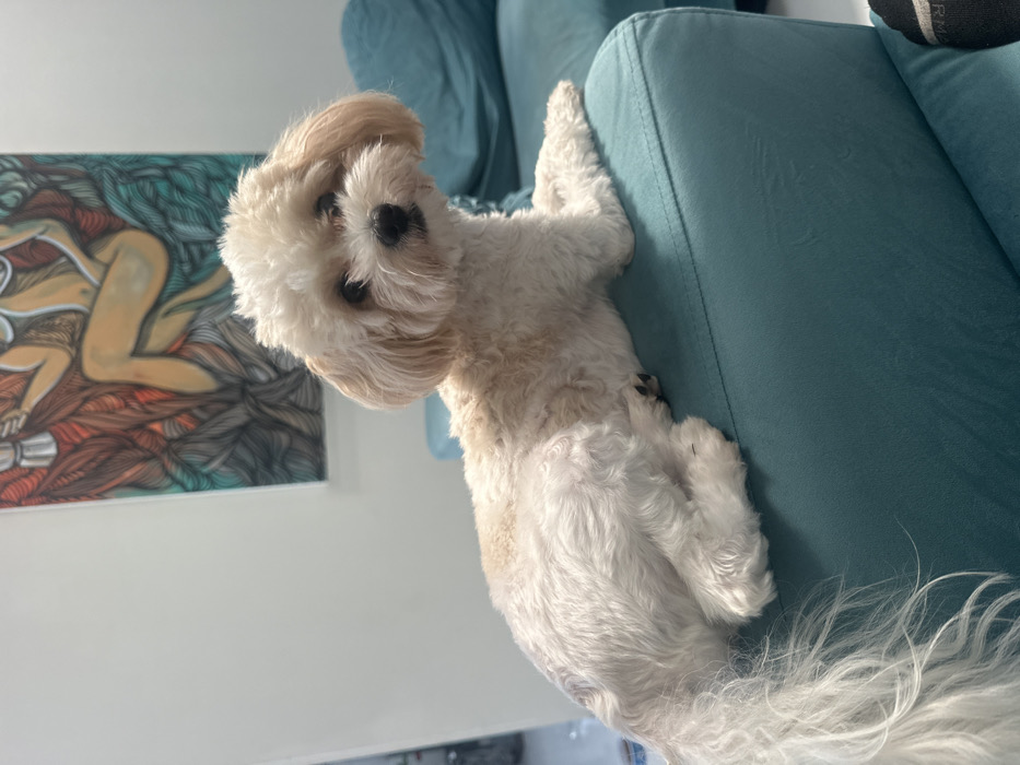 - "A small, cream and white coated dog with trimmed fur is depicted lying on a teal upholstered sofa or chaise" by FM-rBZ9s1, licensed under CC BY 4.0
