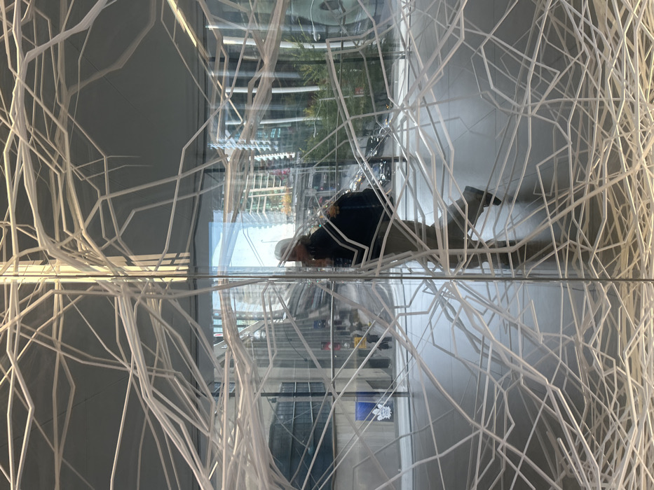 The image depicts an indoor scene looking outwards through a glass partition containing a prominent, three-dimensional geometric sculpture