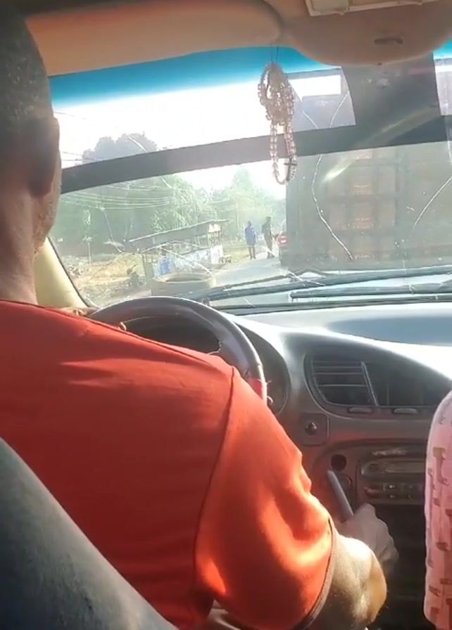 perspective of a driver in a car approaching an intersection. The driver, wearing an orange shirt, is seen from the back. The dashboard of the car is visible, along with a beaded ornament hanging from the rearview mirror. Through the windshield, a large truck is parked on the right side of the road, partially blocking the view. Two men are standing near the truck, one dressed in blue. The surrounding environment appears to be a rural or semi-rural area with buildings and power lines visible in the background. The car seems to be slowing down as it approaches the intersection. There is also a partial view of a person in a pink patterned shirt sitting in the passenger seat.