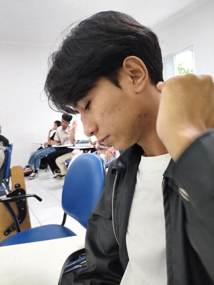 The image displays an indoor classroom scene located in the city of Muka, Indonesia. In the foreground, a young man with dark, swept-back hair is positioned with his head tilted downwards and slightly to his right, his eyes cast down. He wears a white mock-neck shirt beneath an unzipped black jacket. His right hand is raised, with fingers making contact with the skin at the back of his neck/lower hairline. His face shows a fair complexion with some small blemishes visible on his left cheek and jawline. To the left of the foreground subject, a blue-seated classroom chair is partially visible, along with a portion of a white desk surface. The background, largely out of focus, reveals a classroom environment with several other individuals, presumably students, seated at similar white desks equipped with blue-backed chairs. One student in the mid-ground, wearing a light-colored collared shirt, is distinctly seen making a two-finger 'V' gesture with his right hand. The room features plain white walls, a white ceiling, and a window in the upper right corner displaying green foliage outside, indicating natural light. The overall setting appears to be a functional educational facility.