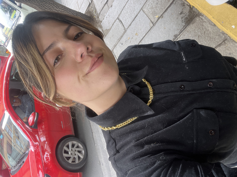 A woman with brown hair and a black button-up shirt poses for a photo. She wears a thick gold chain necklace and has a slight smile. A red car with a visible driver is to her left. The background includes a sidewalk and the edge of a building. The photo is taken from a high angle, slightly tilted.