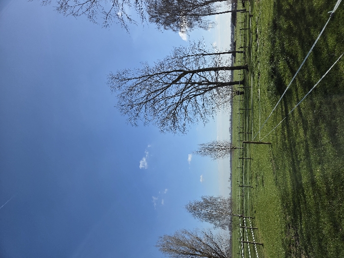 The scene depicts an open, rural landscape identified as being within Eeklo, Belgium, under clear meteorological conditions. The sky, occupying the upper two-fifths of the image, is a bright, unblemished blue with two small, scattered white cumulus clouds visible in the mid-left and lower-left portions of the sky. A faint, white aircraft contrail is present in the upper-left quadrant. The ground, comprising the lower three-fifths, is covered by green grass, exhibiting variations in shade and texture due to direct sunlight and shadows cast by objects. A system of light-colored, likely white, multi-strand electric fence tape or similar material is strung between multiple light brown wooden posts, delineating several enclosures or boundaries across the midground. Two prominent parallel lines of this fencing material extend diagonally from the lower-right foreground into the midground. Multiple deciduous trees, largely bare of foliage consistent with a dormant season (late autumn to early spring), are scattered across the midground and background. Their dark branches are silhouetted against the sky and distant fields. A particularly tall tree stands centrally in the midground, exhibiting a slight lean to the right. Smaller trees are visible in the more distant parts of the field. The horizon line in the background is flat, separating the distant green fields from the sky, with vague indications of distant structures or vegetation. The scene is well-lit by direct sunlight, casting shadows from the trees and fence posts onto the grass. No human or animal subjects are present within the frame, and no actions or interactions are depicted.
