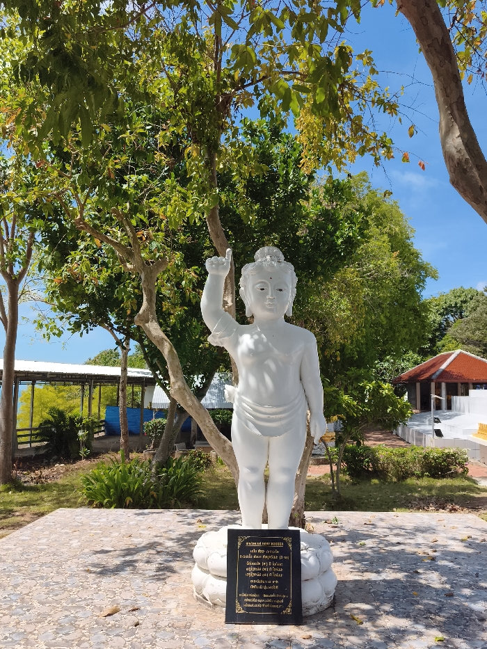 A white statue of a young Buddha stands on a stone platform under a tree. His right hand is raised with a finger pointing upward. A black plaque with text is at the base of the statue. In the background are green trees and plants, and partially visible buildings, one with a red roof. The sky is blue with scattered clouds.