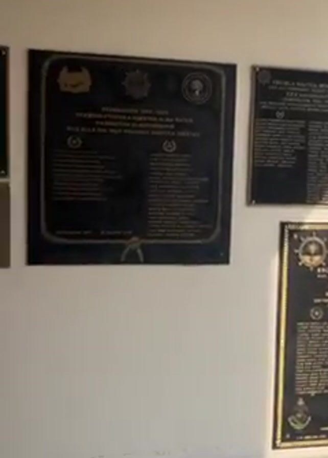 wall in a hallway or building with several plaques attached. The plaques are dark with gold lettering and borders, and they commemorate different generations of students from "Escuela Nautica Mercante". The plaques list names and other information. The wall is light-colored. The video pans slightly to show more of the wall and plaques.