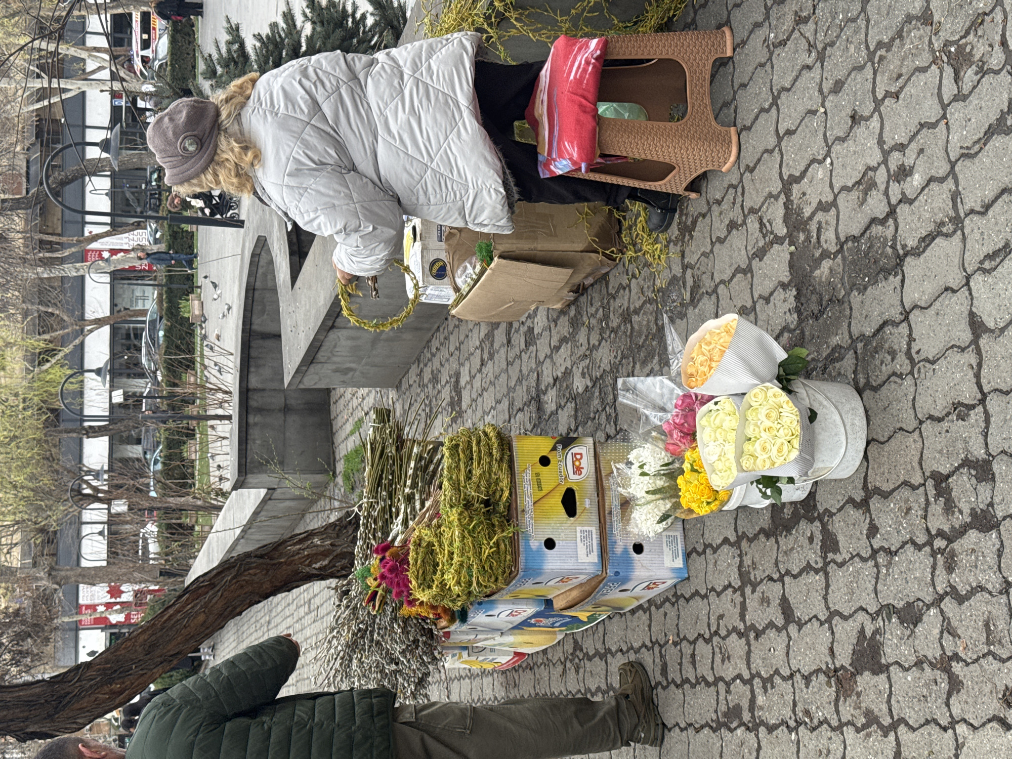The scene is a street in Yerevan, Armenia. An elderly woman wearing a gray hat and a white quilted jacket is working at a makeshift flower stand set up on the sidewalk. She is leaning over a cardboard box, holding a wreath made of green twigs. A man in an olive green jacket and pants is standing in front of her, seemingly purchasing something. The flower stand consists of several stacked cardboard boxes, likely used for shipping fruit. On top of the boxes are bundles of willow branches with catkins, as well as bundles of green twigs and some colorful flowers. Nearby, in a metal bucket, are several bouquets of roses in white, yellow, and pink. The woman is sitting on a small, brown plastic stool with a red and blue patterned fabric on top. The ground is paved with interlocking concrete bricks. In the background, there are buildings, trees, and street furniture.