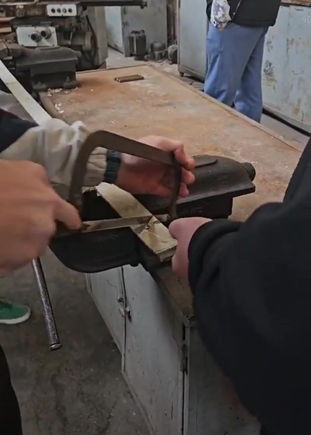 Two people are using a hand saw to cut a piece of metal held in a vice mounted on a workbench. The person on the left is guiding the saw with their left hand, while the person on the right holds the other end of the saw. The workbench is in a room with other metalworking tools and equipment visible in the background. A third person stands in the background, facing away from the camera.