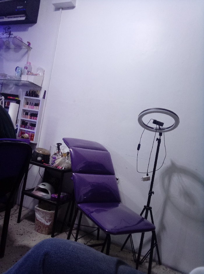 A purple padded salon chair sits in a room next to a dark metal table with nail supplies. A small white trash can is visible under the table. Behind the chair is a tall ring light on a tripod. To the left, partially visible, is a black salon chair and a shelf stocked with nail polishes and supplies. The room's walls are a stark white. A glimpse of a person's leg, clad in jeans, is in the foreground.