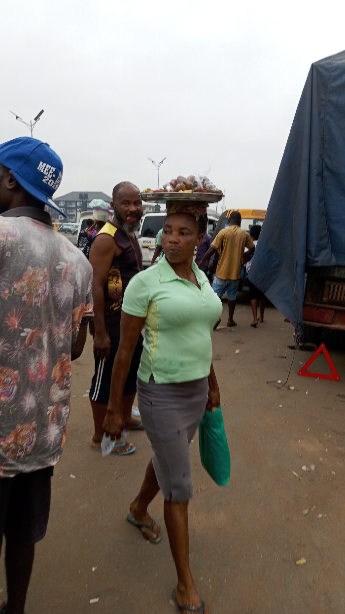 The image depicts a busy outdoor street or market scene in Onitsha, Nigeria, under an overcast sky. In the foreground, a woman walks right-to-left, balancing a large, round silver metal tray on her head. The tray holds various packaged items, possibly snacks or produce. She wears a light green short-sleeved polo shirt, grey knee-length shorts or skirt, and grey flip-flops. Her left hand holds a crumpled green plastic bag. To her left, a man with a beard and dark, short hair is visible, wearing a dark sleeveless top with yellow trim and dark shorts with white vertical stripes. He looks towards the camera with his tongue slightly extended. Behind him, another individual, with their back to the camera, wears a patterned t-shirt and a dark blue baseball cap with white text partially visible, reading "MEE-D 202-". In the midground and background, several other people are present, walking or standing. Various vehicles are parked or moving, including white vans and a yellow bus. On the far right, a dark blue tarp covers a portion of what appears to be a large truck. A red triangular hazard warning sign rests on the ground next to the truck. The ground is an unpaved or dirt-covered surface, scattered with small pieces of litter. Streetlights or power line structures are visible against the bright, featureless sky.