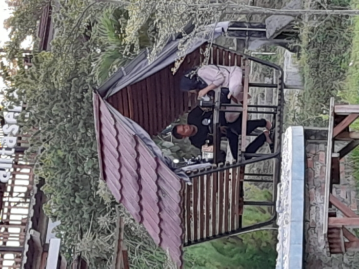 - "Two individuals, a man and a woman, are seated inside an open-sided wooden hut with a reddish-brown tiled roof and slatted wooden walls, situated in Penanggungan, Indonesia" by FM-8CAHW2, licensed under CC BY 4.0