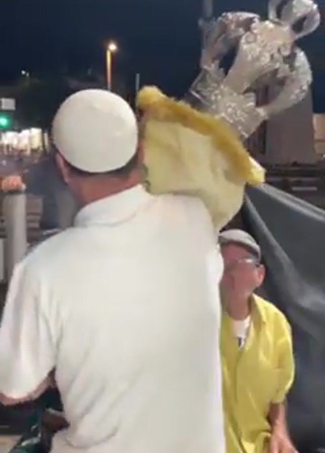 group of men gathered at night, near what appears to be a street or outdoor venue. One man is carrying a large ornamental crown, made of what looks like silver metal and adorned with a yellow collar or trim. The crown seems to be draped in white and black fabric. Several men are gathered around, observing and potentially assisting with the crown. The men are dressed in casual attire, including white shirts and caps. The environment is dark, with some streetlights visible. There is a small table and some chairs in the foreground, and the scene is somewhat crowded. The overall atmosphere suggests a public event or celebration.