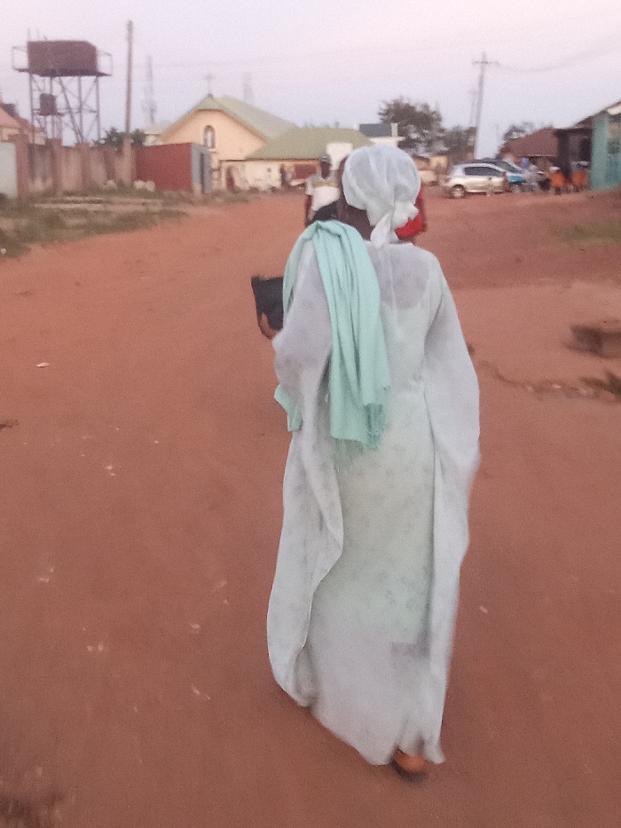 The image depicts a person walking away from the camera on an unpaved, reddish-brown dirt road during what appears to be dawn or dusk, characterized by a pale, diffused sky. The scene is located in a residential or semi-urban area of Jos, Nigeria, identifiable by common architectural styles and road conditions prevalent in the region. **People:** One individual is in the foreground, viewed from behind, wearing a long, light-colored dress or robe, a white head covering, and a light blue/mint green cloth draped over their left shoulder. A red object is visible on the back of their head. They are holding a dark, rectangular object (possibly a book or small bag) in their left hand. Brown footwear is visible. In the distant background to the right, a small group of indistinct figures can be observed near parked vehicles. **Subjects/Objects:** The foreground is dominated by the reddish-brown earth road. In the midground to the left, a tall metal-framed water tower stands behind a light-colored fence. Adjacent to this fence is a beige building with a green sloped roof and a prominent arched entrance, identified as a church by its architectural style and visible cross on the roof. A reddish-brown metal structure, possibly a shed or container, is located near the church. In the midground to the right, utility poles with power lines are visible, along with indistinct residential structures. In the background right, several parked vehicles, primarily silver-colored, are visible on what appears to be another section of the road or a parking area. **Environment:** The ground is entirely unpaved, consisting of reddish-brown dirt with minor scattered debris. The sky is a uniform pale greyish-pink, indicating low light conditions. Sparse vegetation is visible along property lines. The overall impression is that of a developing residential area with mixed infrastructure.