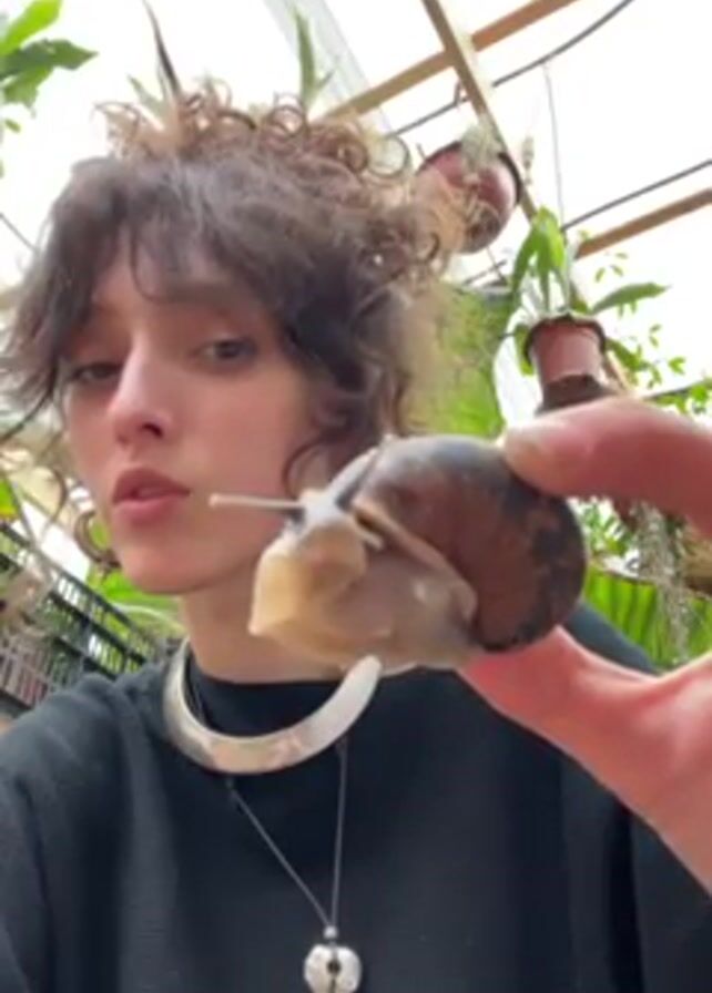 A person with curly brown hair, wearing a black top and silver jewelry, holds a large brown snail in their hand