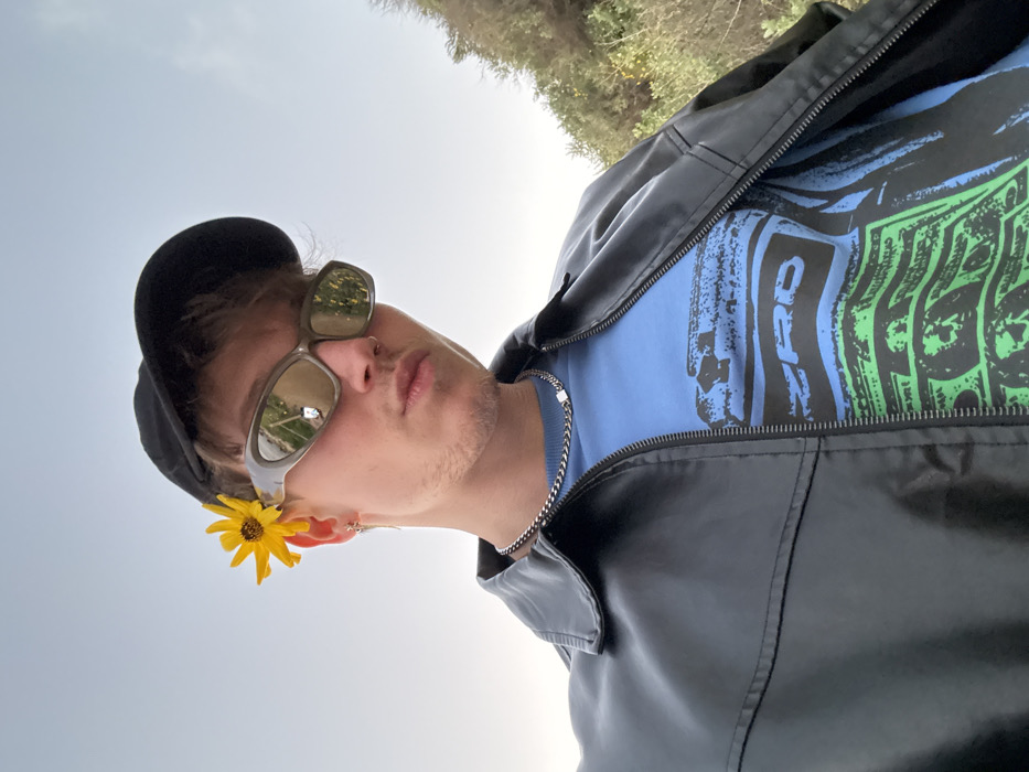 A person in sunglasses and a black cap poses outdoors. A yellow flower is tucked near their ear. They wear a black leather jacket over a blue t-shirt with green and black graphics and a silver chain necklace. The sky is light and muted. Trees are visible in the blurred background. The person has a nose ring and light facial hair. The photo is taken from a low angle and the image is rotated.