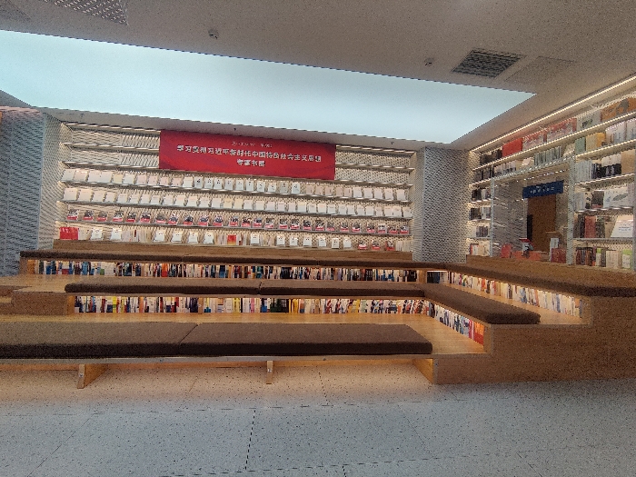 The image displays a modern library interior with tiered seating. Each level houses books, acting as steps to the next. Books are also arranged on shelves in the background. A red banner hangs above the back shelf, with Chinese characters on it. The space is well-lit, enhancing the warm tones of the wood. The design emphasizes accessibility and engagement with the books.