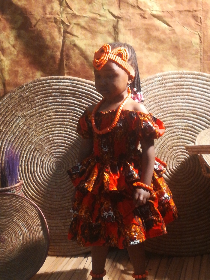 An indoor portrait depicts a young child, appearing female, standing in an upright position in Unknown, Unknown. The child wears a short, off-the-shoulder dress made of red, orange, and black patterned fabric, which includes motifs resembling stylized lion faces, featuring a tiered skirt. Adornments include an orange beaded headpiece on the forehead, orange beaded earrings, a multi-strand orange beaded necklace, a single orange beaded bracelet on the left wrist, and orange beaded anklets on both ankles. The child's dark hair is styled in braids, with pink and purple beads visible at the ends of some braids on the right side of the head. The child's gaze is directed slightly to the right of the viewer. The background consists of a textured, crinkled brown-orange fabric backdrop, behind which several large, circular woven straw mats or baskets with concentric ring patterns are arranged. A smaller, dark woven basket containing purple fibers is partially visible on the far left. The floor appears to be light-toned wood. The scene is illuminated by warm, directional lighting, casting soft shadows.