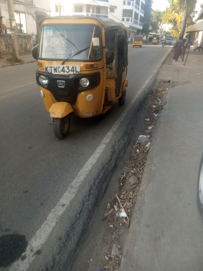 The image depicts a street scene within the Ganjoni/Shimanzi ward, Kenya, illuminated by natural daylight. A yellow auto-rickshaw (tuk-tuk) with Kenyan registration plate K TWC 434L is centrally positioned on an asphalt road, angled slightly towards the right, appearing either stationary or in slow motion. The vehicle features a black front grille with "RE" branding and shows minor scuff marks on its lower front bumper. To the immediate right of the auto-rickshaw, a concrete gutter runs parallel to the roadway, filled with a substantial quantity of refuse including plastic bags, paper debris, and organic matter. Adjacent to the gutter is a paved sidewalk or shoulder. In the background, the road extends into the distance, populated by other vehicles including at least two more yellow auto-rickshaws, one motorcycle, and a light-colored van. Multi-story buildings constructed of light-colored masonry line both sides of the street. On the far right side of the image, a person dressed in dark clothing is observed walking on a sidewalk, moving away from the camera. A portion of a wheel from another vehicle, likely the camera source, is visible in the extreme lower right foreground.