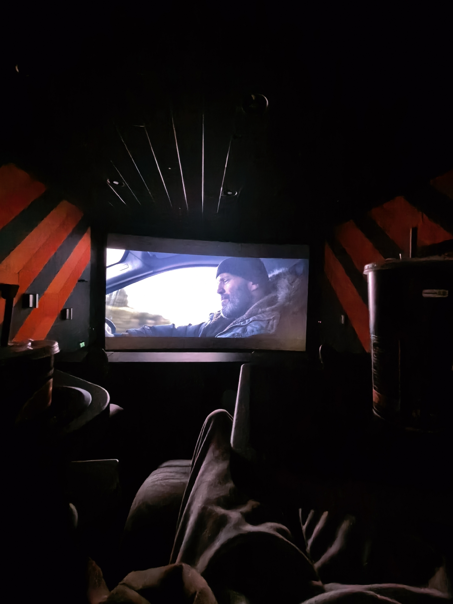 The image displays the interior of a darkened cinema hall, identifiable by its diagonal orange and black striped wall panels, consistent with a Cinema City location in Sofia, Bulgaria. A film is projected onto a central screen, depicting a bearded male subject wearing a dark beanie and a fur-lined jacket, driving a vehicle. A brightly lit outdoor landscape is visible through the vehicle's window. The viewpoint is from a seated observer in a cinema chair. The foreground shows legs covered by dark fabric. A dark beverage cup with a lid and straw is positioned on a cup holder to the left, and a larger dark cylindrical container is visible on a cup holder to the right. Dark cinema seating partially frames the lower portion of the image. The ceiling features parallel horizontal strips.