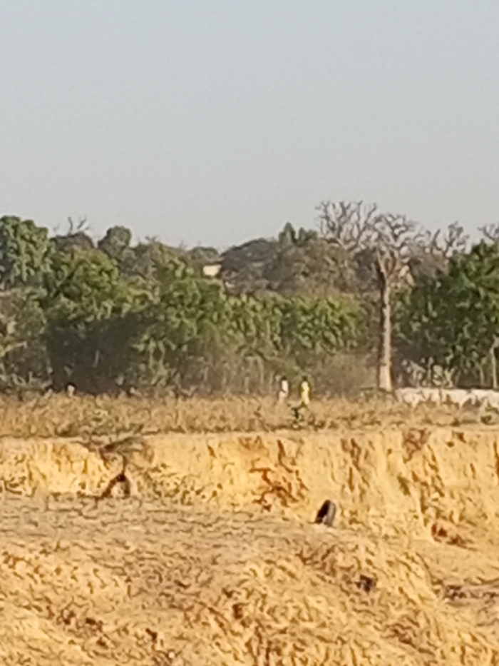 The image depicts an outdoor landscape in Babawa, Nigeria, under a clear, pale blue sky. The foreground is dominated by an extensive area of light-brown, textured earth, consistent with dry soil or sand, which rises to form an eroded bank or cliff face in the midground. A dark, circular object, possibly a tire, is partially embedded in the lower right section of this earthen bank. Above the bank, a strip of dry, light-brown vegetation stretches horizontally. Two human figures, indistinct due to distance, are observed standing or walking on this vegetated strip. They appear to be wearing light-colored clothing. The background features a dense treeline composed of various trees, some with green foliage and at least one prominent, large, bare-branched tree on the right side. A small, light-colored structure is partially visible amidst the foliage in the distant central-left background.