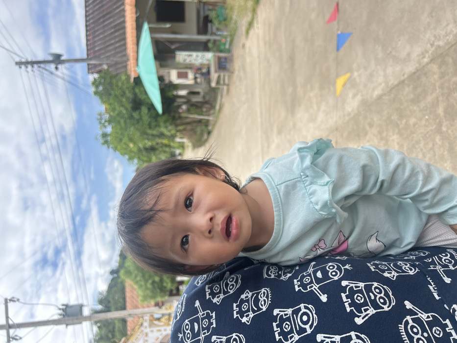 A young child, appearing to be approximately 1-2 years old, is held on the left side of the frame by an unseen individual wearing a dark blue garment patterned with white Minion characters. The child has dark hair, dark eyes, and is wearing a light blue long-sleeved top with ruffled shoulders and white bottoms. The child's expression is solemn, with eyes looking slightly upwards and a slightly open mouth, indicating potential distress or apprehension. The scene is an outdoor setting, likely a village or residential street in Ensavan, Laos, under a partly cloudy sky. The ground in the foreground is paved, light-colored concrete. To the immediate right of the child, on the ground, are three small, triangular, colorful flags (yellow, blue, red) placed in a line. In the background on the left, a portion of a white and gold ornate structure, consistent with a temple or traditional Lao building, is visible. Further into the background on the right, a narrow dirt or unpaved road recedes, flanked by green foliage and trees. A single-story building with a dark tiled roof is present on the right side of the road, featuring a teal open parasol providing shade over what appears to be a wooden table or bench. Utility poles with power lines and a mounted speaker are also visible in the background, extending across the frame. Hills or elevated terrain are visible in the far background.