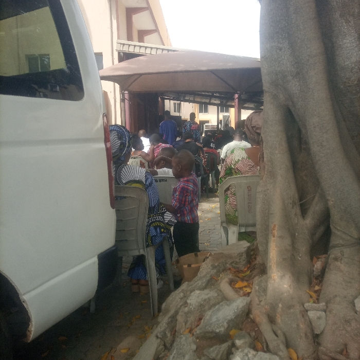 The scene depicts an outdoor gathering in Abuja, Nigeria, illuminated by daylight
