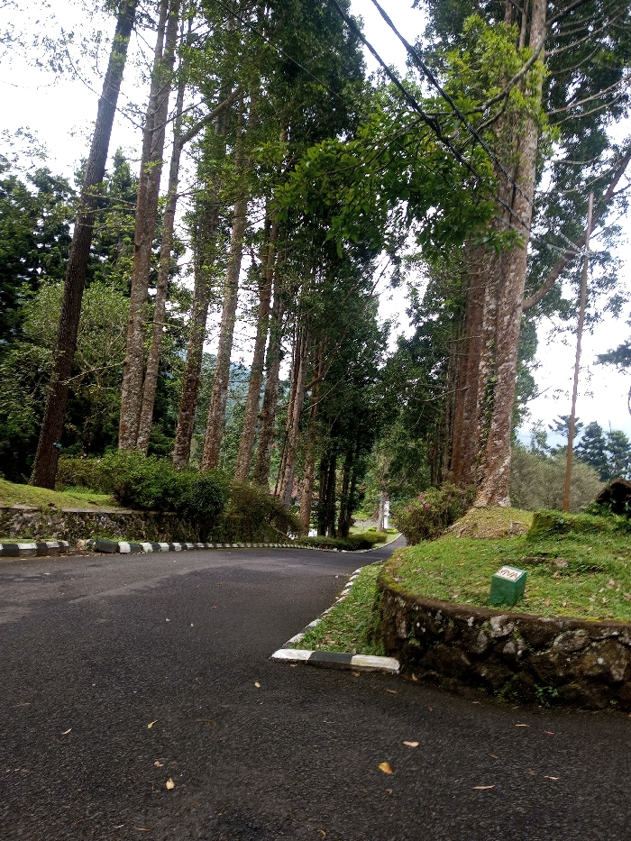 A curved, dark asphalt road in Padegaon, India, extends from the foreground into the mid-ground, initially turning left before a gentle rightward curve. The road is bordered by black and white striped curbs, which delineate it from raised, grassy embankments on both sides. On the left, a low, mortared stone wall supports a bank of dense green shrubs and tall, slender trees with light-colored bark. On the right, a similar stone wall and grassy verge are visible, with a small, green rectangular marker partially embedded in the grass in the foreground. Numerous tall, coniferous-like trees with green foliage line both sides of the road, forming a dense canopy and extending vertically to the upper frame. The sky is overcast. Distant, tree-covered hills or mountains are faintly visible in the background. Overhead utility lines are observed spanning across the upper right section of the image. No individuals or active subjects are present.