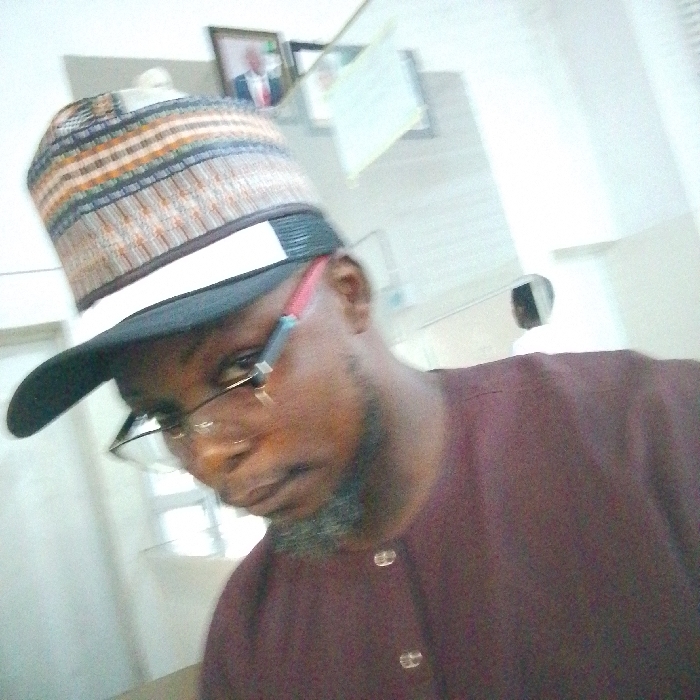 The image displays a close-up, slightly tilted portrait of an adult male situated indoors. The individual has a dark complexion, a short, patchy beard, and is wearing clear-framed eyeglasses with red temples. He is dressed in a multi-colored cap featuring stripes in shades of brown, orange, black, white, and blue, complemented by a black brim and a white band. His upper garment is a dark red, traditional-style top with four light-colored buttons visible down the front. The man is looking directly towards the camera. The background reveals a light-colored wall decorated with at least one framed portrait of a person in a suit and several other framed rectangular objects, likely documents or certificates. A faint reflection, possibly of a window or light source, is visible on the right side of the background. The exact location within Lokoja, Nigeria, cannot be determined from the visual information provided.