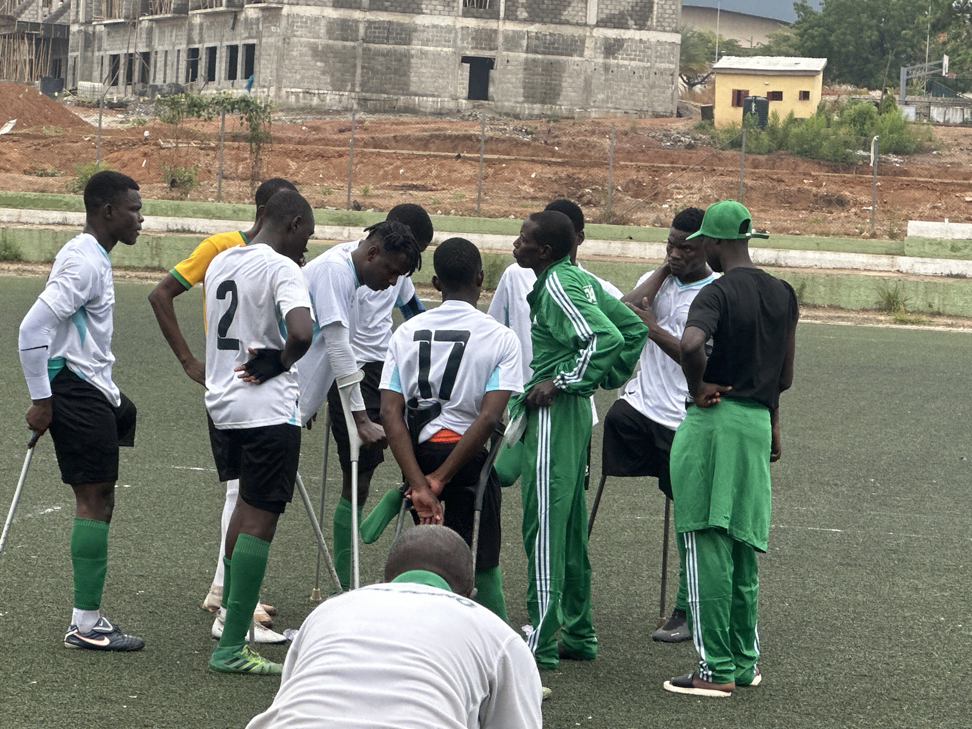 A group of approximately 10 African males are congregated on a green artificial turf field in Unknown, Unknown. Some individuals wear white and black soccer uniforms, while others are in green tracksuits. Several of them use crutches or walking sticks, suggesting physical disabilities. A partially constructed concrete building is in the background, along with a small yellow building. The ground is covered in red dirt. The overcast sky suggests it may be daytime.