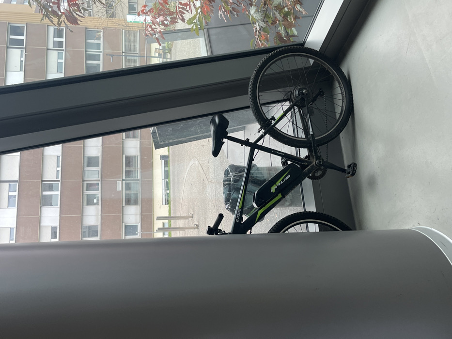 The image depicts an indoor view looking out through an angled, multi-pane glass window at the outdoor environment of a university campus in Strasbourg, France, specifically consistent with the Esplanade campus of the University of Strasbourg. In the left foreground, a large, light grey cylindrical pillar partially obscures the scene. A black "E-3300U" electric bicycle, equipped with a prominent bright green battery pack on its frame, is parked indoors on a light grey floor, resting on its kickstand, positioned adjacent to the window. Outside the window, a paved courtyard area is visible, featuring several metallic bollards and a dark grey cylindrical trash can. In the background, a multi-story building with a brown facade and numerous windows, many fitted with white external blinds, stands under an overcast sky. Patches of foliage with reddish-brown leaves are visible outside the window on the right side. No individuals are present.